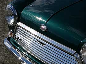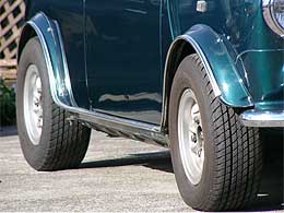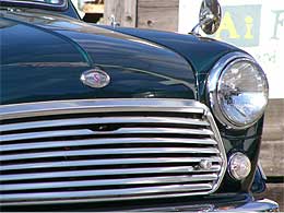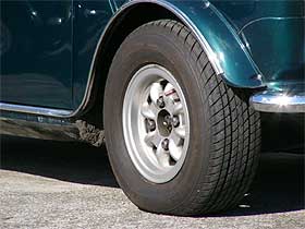 | 10インチ化された足回りに履くホイールは、現在では入手困難な上に高価なミニライト製マグネシウムホイールを奢っています。 軽量なマグネシウムである事と、デザインで今でも人気が高く、ミニに似合うホイールです。 どうですか?カッコイイと思いませんか? |