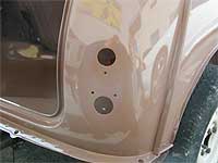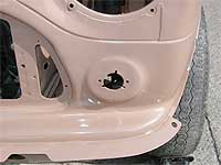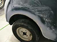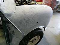 | MK−I仕様とする為、ボンネット、トランクも板金処理。 トランクは計11箇所の穴埋めを行います。 | 今回、フェンダーレスで仕上げる為に、オーバーフェンダー用ビス穴も全て埋めています。 | フロントフェンダーもリア同様に穴埋め加工。 | ||