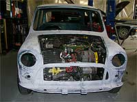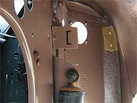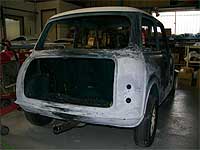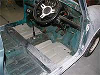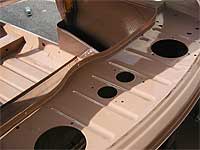 | まずは、下地造りから。錆び取りはもちろん、ボディの状態確認もシッカリと行います。 | MK−Iテールを取り付ける為にアダプタを溶接。 ファイバー製の物は直ぐにクラックが入ってしまう為に、鉄製の物を使用します。 | フロアのアンダーコートは、仕上げをキレイにする為に剥がして処理。 | ||