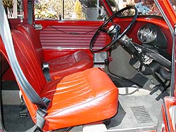 室内も基本はオリジナル。 適度にやれたシートや大きなステアリングが良い。 シフトレバーが足元の方から生えているのにも注目。 これはダイレクト・ミッションの証。 |