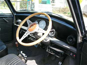 新車時から変更済みのセンターメーターKIT、そしてミニの定番モトリタ製ウッドステアリング、エクステリアにあわせシート及び内張りはブラックレザーで統一。 多少の使用感はありますが、16年と言う年月を経ていると考えれば、異常にBESTコンディション。 雰囲気はバツグンです。 |