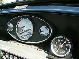 | スミス製3連センターメーターにタコメーター。 見慣れた光景ではありますが、やっぱりシックリくるスタイル。 吊り下げ式クーラーを装備の為、メーター脇をスッキリまとめられるのは嬉しいですね。 |