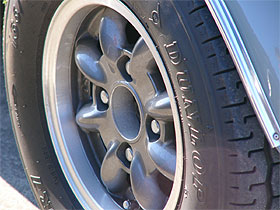 ミニライトタイプのアルミホイールは5J−10インチ。 5Jサイズにする事により(ノーマルは4.5J)、タイヤは外に張り出し安定性が増す。 また、8本スポークのデザインはミニに良く似合う。 タイヤもR7とグリップの良さとデザインの良さを兼ね備えており、オールド風のスタイルにマッチしながら、走りも損なわないように選択。 |