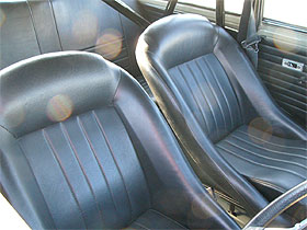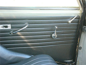 ノーマルのプラスティックのハンドルは、変更したいと思っている人も多いが、意外と値段が高いので交換出来ないでる人も。 また、シートに合わせた黒レザーの内張りもレーシーなイメージに一役かっている。 |