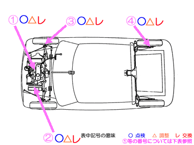 | @消耗品交換 油脂類交換 キャブレター点検整備 点火系点検整備 各油圧系点検整備 A水回り各部点検整備 Bサスペンション各部点検整備 Cブレーキ各部点検整備 |