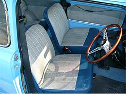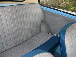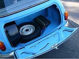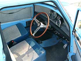 エクステリアの雰囲気と合わせ、インテリア空間も当然NEWトリムを使用してのフル仕立て。 シート、カーペット共にNEW。 更にセンターメーターやレブカウンター、センターKey等もNEWパーツを使用しています。 さりげなく吊り下げ式クーラーとCDデッキも装備。 オールドのミニの良い雰囲気に快適さをプラスしました。 大人げなレスレストンGPウッドステアリング(レアパーツです)がさらに良い感じです。 |