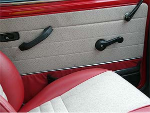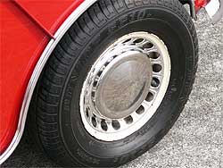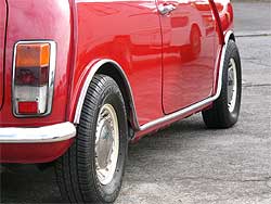 フェンダーレス化するのに、元のオーバーフェンダーが付いていたビス穴は穴埋め加工し、ホイールもあえてアルミではなく、スチールホイールを選択しています。 メッキのホイールリングにセンタークアップが、何ともいえない雰囲気を出していますね。 フェンダーレスはミニの定番スタイルであり、ミニが一番ミニらしく見えるのがカワイイですね。 |