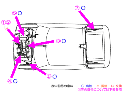 | @油脂類交換 A消耗品交換 ・プラグ交換 ・ディスキャプ交換 ・ロッカーカバーガスケット交換 Bコンピューター・チェック ・ポテンション・メーター交換 C水回り点検整備 Dクラッチ油圧系点検整備 E足回り各部点検整備 ・ドライブシャフトアウターブーツ交換 Fブレーキ回り各部点検整備 ・リア ホイールシリンダASSY交換 ・ブレーキシュー交換 ・ブレーキフルード交換 |