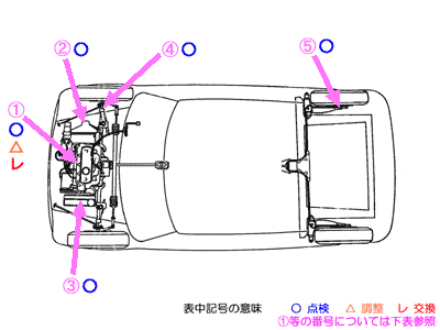 | @油脂類交換 エンジン各部点検調整 Aクラッチ油圧系点検 B水回り点検 C足回り各部点検 Dブレーキ回り各部点検 |